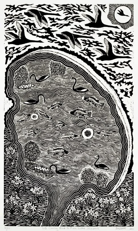 Image: Badger Bates, 2011, Life coming back to Moon Lake, Wilcannia, linocut, black ink on paper.